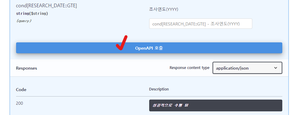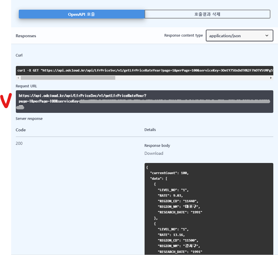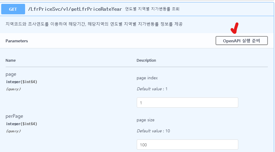 2. ํ์ผํฌ๋งท์ JSON, 1ํ์ด์ง์ ํ์ด์ง๋น ๊ฑด์๋ฅผ 100๊ฑด์ผ๋ก ์ค์ ํ์ฌ API ํธ์ถ.