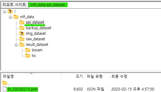 _20230215.json์ผ๋ก ๋ณ๊ฒฝ ํ FTP์๋ฒ์ /nifi_data/api_dataset ํ์์ ์ ์ฅ