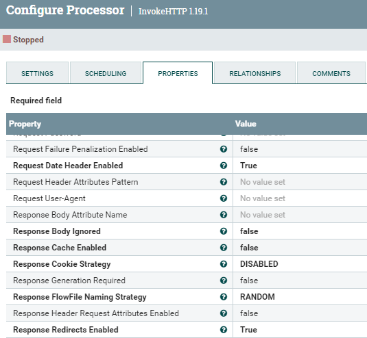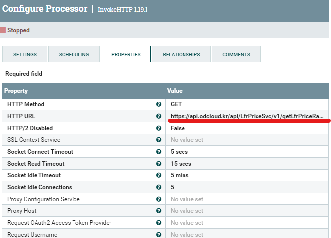 - InvokeHTTP ํ๋ก์ธ์ค ์์ฑ ์ค์