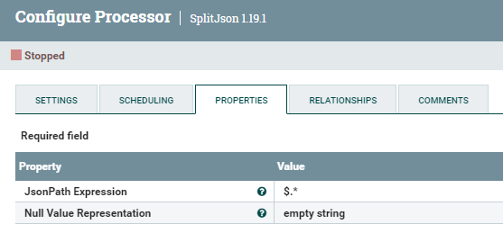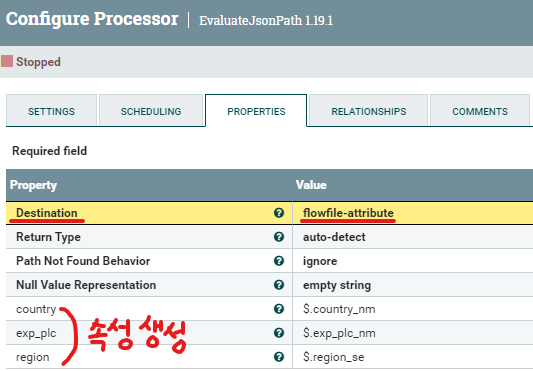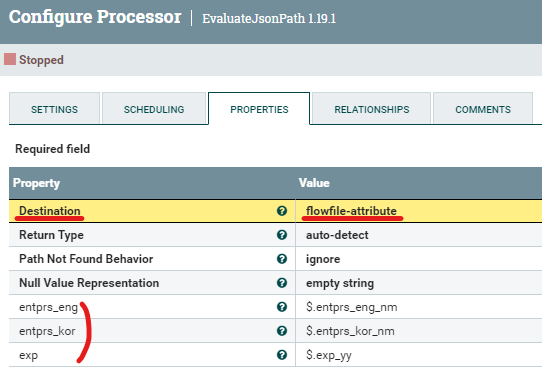 ๋ถ๋ฌ์จ ๋ฐ์ดํฐ EvaluateJsonPath ํ๋ก์ธ์ค๋ก entprs_eng_nm, entprs_kor_nm, exp_yy ํญ๋ชฉ ์์ฑ ์์ฑ