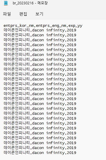 FTP์๋ฒ์ ์ฌ๋ ค์ง๋ ๋ฐ์ดํฐ๋ entprs_eng_nm, entprs_kor_nm, exp_yy ํญ๋ชฉ๋ง ๋์ค๋๊ฒ!