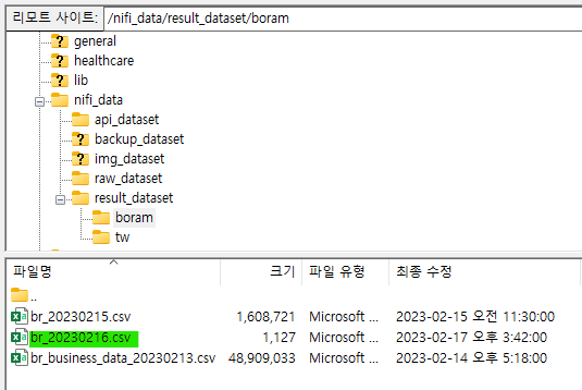 FTP ์๋ฒ /nifi_data/result_dataset ์์น์ ํ์ผ์ด ์ ์ฅ๋๋๋ก ํ๋ค.