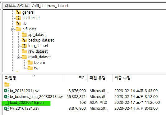 5. FTP ์๋ฒ /nifi_data/raw_dataset ๋๋ ํ ๋ฆฌ์์ load_20230216.json ๋ฐ์ดํฐ ๋ถ๋ฌ์ค๊ธฐ