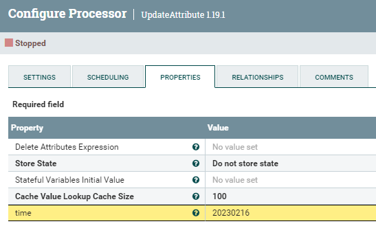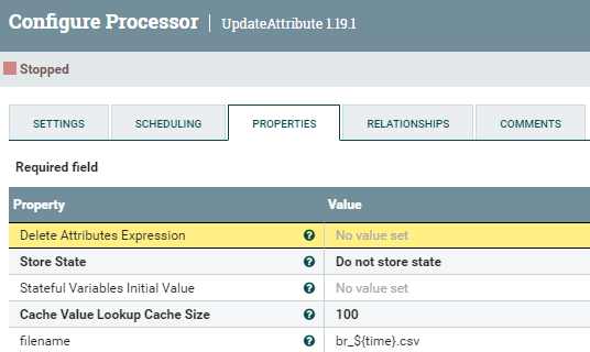 UpdateAttribute ํ๋ก์ธ์ค๋ก ํ์ผ๋ช ์ br_20230216.csv ๋ก ๋ณ๊ฒฝ