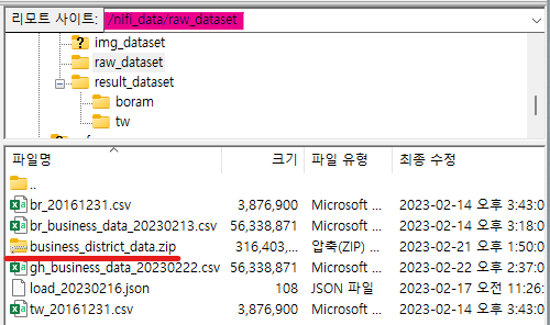 1. FTP μλ² (172.30.1.3) /nifi_data/raw_dataset/ λλ ν 리μμ business_district_data.zip νμΌ μμ§ (μλ³Έ μ μ§)