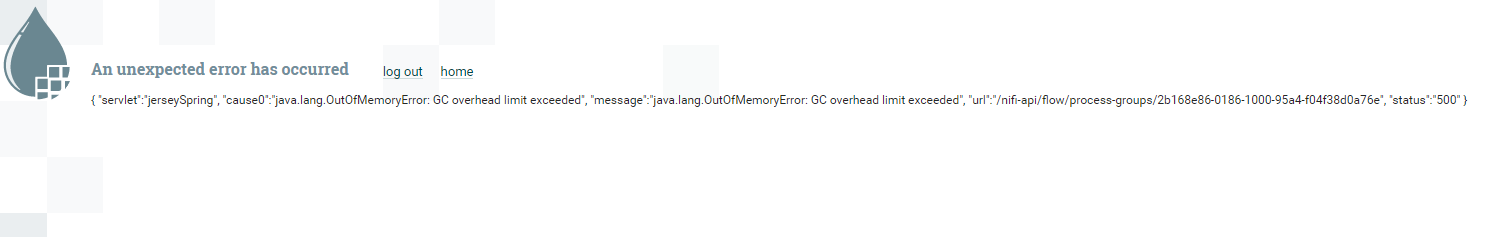 { "servlet":"jerseySpring", "cause0":"java.lang.OutOfMemoryError: GC overhead limit exceeded", "message":"java.lang.OutOfMemoryError: GC overhead limit exceeded", "url":"/nifi-api/flow/process-groups/2b168e86-0186-1000-95a4-f04f38d0a76e", "status":"500" }